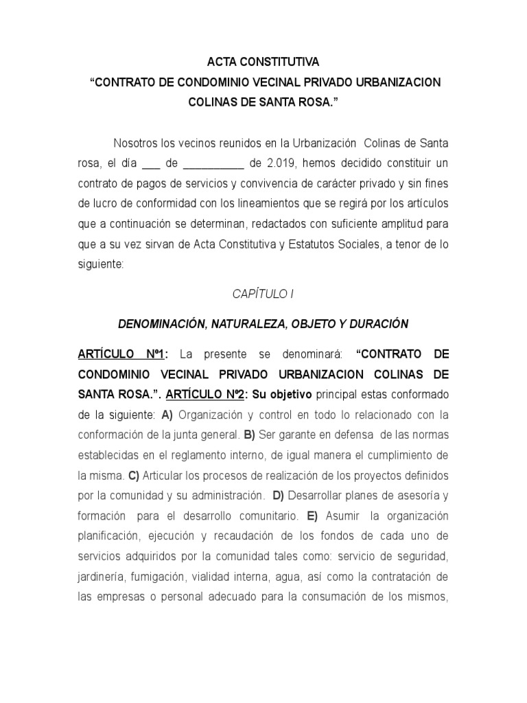 Entre la Junta de Condominio _____ inmueble ubicado en la Avenida _____ urbanizacin _____ Municipio ____ del Estado _____ en el rea Metropolitana de _____ representada en este acto por su Presidente ciudadano _____ quien es de nacionalidad venezolana. Contrato de prestaciÓn de servicios consistentes en la administraciÓn de inmuebles en condominio que celebran por una parte la asamblea general de condÓminos del contratante ubicado en la calle giotto nÚmero 520 colonia mixcoac delegacion benito juarez distrito federal al que en lo subsecuente se le denominarÁ como el contratante representado en este acto por los cuatro. Es aquella situación jurídica en la que dos o más personas se convierten en propietarios conjuntos de una cosa es decir son propietarios de una cuota o parte del bien común.