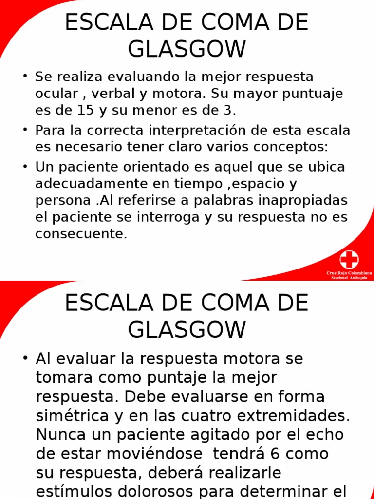 INTRODUCCION En el siguiente trabajo trataremos acerca de la escala de Glasgow a través de la cual realizamos una medición y evaluación del estado psiconeuromotor de pacientes politraumatizados y con traumatismo craneoencefálico y demás esta nos ayuda a conocer que tan complicada es la gravedad de nuestro paciente gracias a una escala de. La Escala de Coma de Glasgow es una escala de aplicación neurológica que permite medir el nivel de conciencia de una personaUna exploración neurológica de un paciente con traumatismo craneoencefálico debe ser simple objetiva y rápidaLa evaluación del nivel de conciencia es el parámetro más importante que debe tenerse en cuenta. Para ello basándose en la escala GOSE se ha desarrollado la escala de resultados al alta.