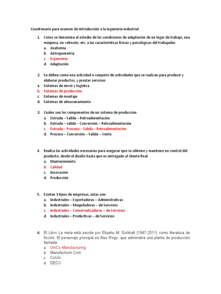 Cuestionario Para Examen De Introduccion A La Ingenieria Industrial Pdf Ingenieria Industrial Logistica