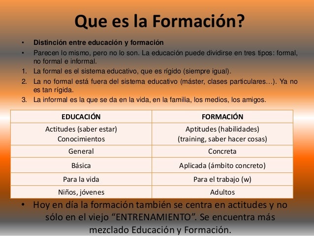 En segundo lugar el término formación representa ese proceso de aprendizaje de adquisición de conocimientos y habilidades que un individuo es capaz de recibir que sin duda alguna es relacionada con la educación. Se entiende que es cuando te instruyen desde pequeñ para que sean alguien en la vida como por ejemplo mis padres me intruyen en el camino de una buena educacion yo yo no me corromperé porque tengo una buena educación así como pude afer formaciones productivas así puede aver malas como por ejemplo me crío en un hogar donde no hay reglas hay licor ya me están enseñando mal y. Formación es el proceso y el efecto de formar o formarseEsta palabra procede del latín formatioEsta palabra se aplica en diferentes ámbitos.